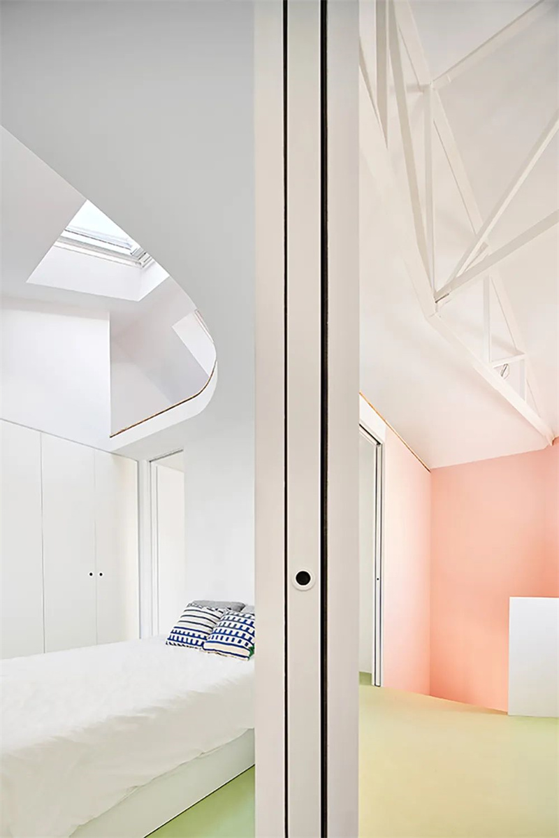 空间的改造引入了新的几何元素,并融入了曲线;在一层,隔墙被全部拆除,以形成一个完整的起居空间,而外露的钢柱则成为该区域中心的亮点。在二层,三面坡屋顶的支撑结构装点着整个空间。除此之外,曲线的隔墙和天花造型将卧室和工作室空间加以分隔。