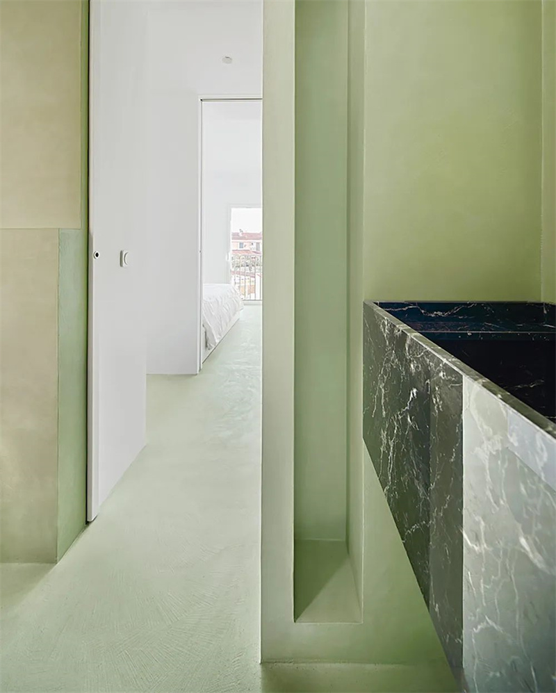 每层空间都选用了独特的配色。为了实现这一设想,西班牙设计团队 Espacio Papel Arquitectos 引入了 Cement Design 材料,将其应用于室内各个角落,为整个室内增添了活力和个性,呈现出独特的质感和外观。同时,Cement Design的运用不仅在视觉上为空间带来独特的魅力,也在耐用性和实用性方面提供出色的性能,与年轻夫妇的生活方式完美契合