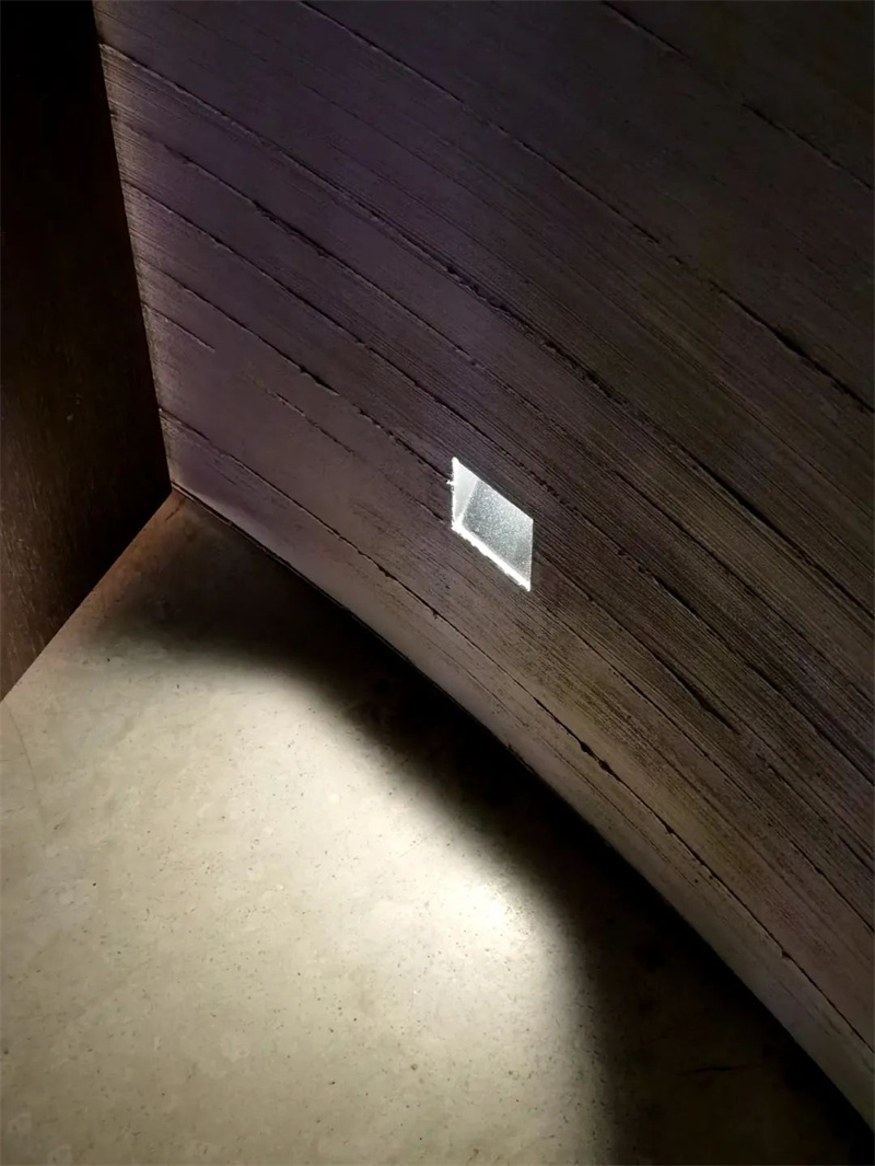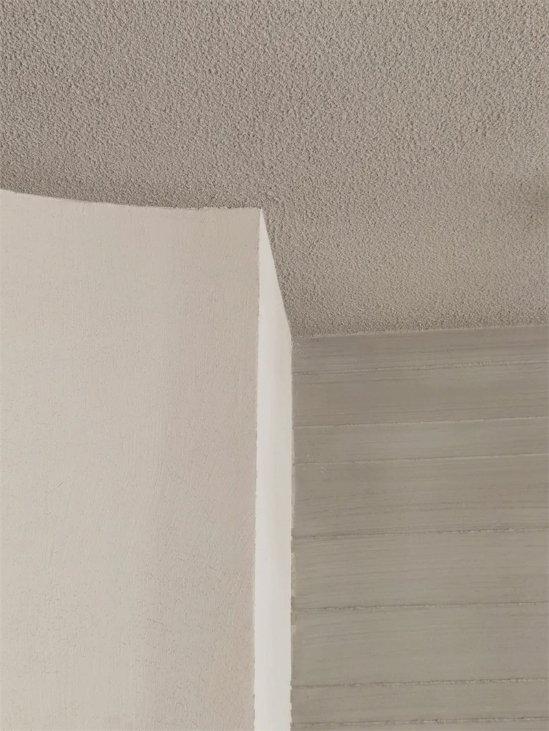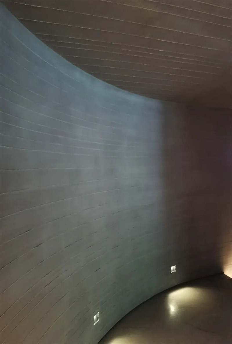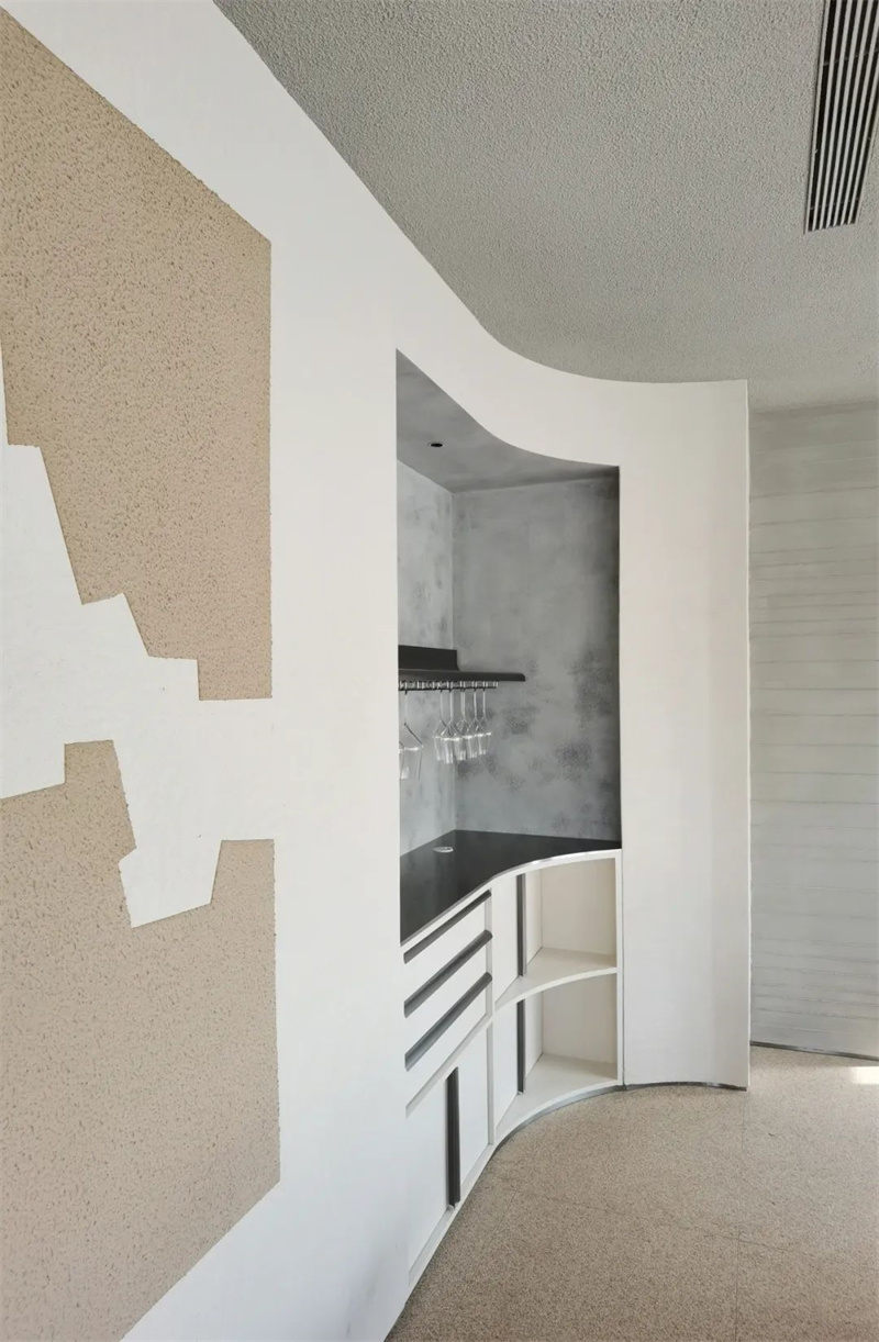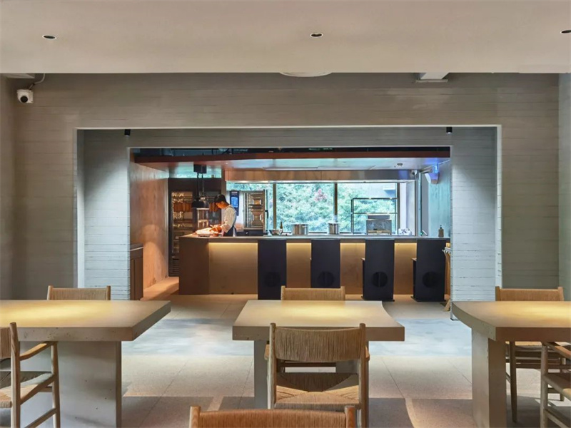 Stepping on the stairs, enter the restaurant interior following the guidance of the curved wall. Despite the current autumn season, Shanghai's autumn arrives a bit late; the view from the restaurant's windows remains lush and verdant, much like the height of summer. Inside, abundant natural light streams in through the glass windows, illuminating the entire space. The exterior wall's textures extend into the inside, and under the brighter light, the handcrafted, irregular imprints become even more pronounced, imbuing the space with intricate details and depth