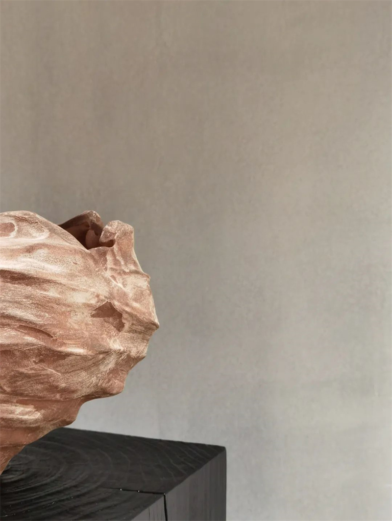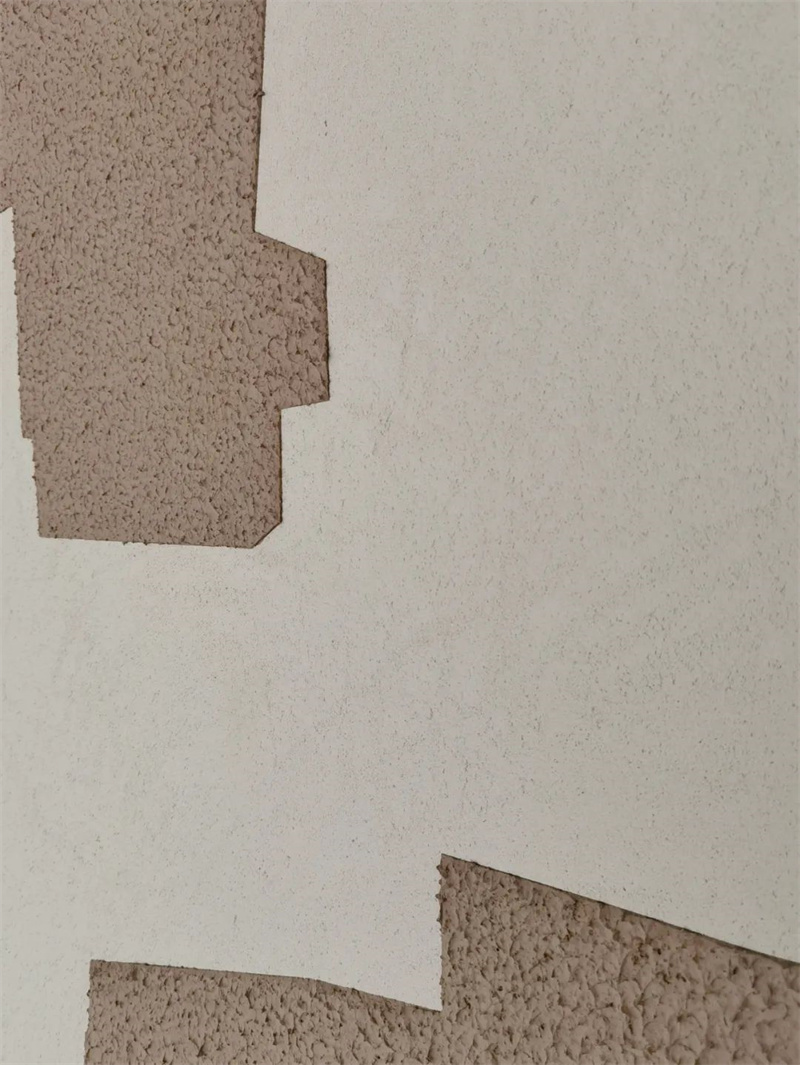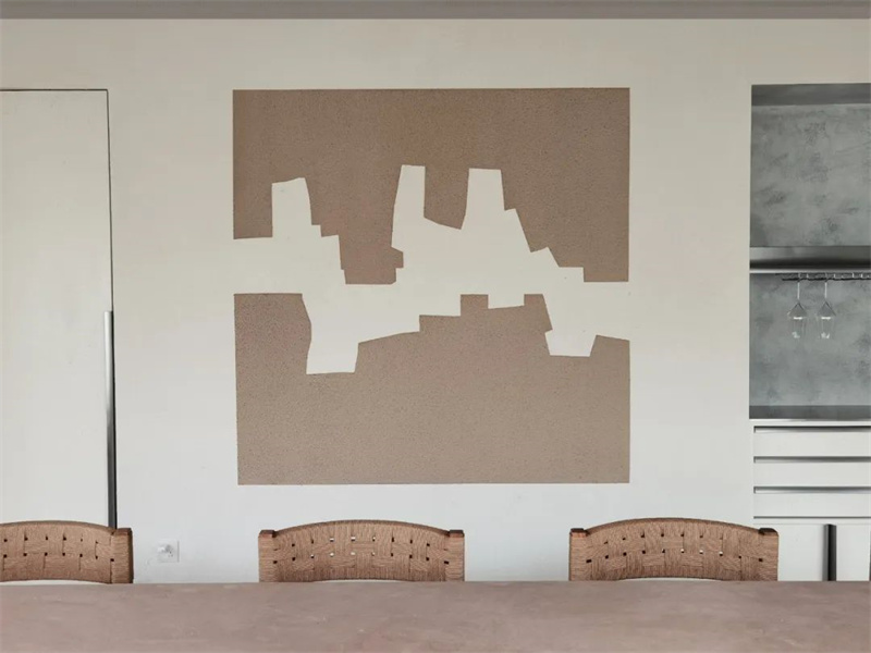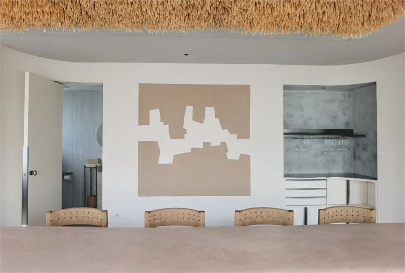 深入餐厅内部,阳光最充足的位置被预留作为私密度更高的包厢。覆盖了大部分餐厅墙面的灰色纹理在这里与别样的米白色衔接,墙面的正中则是由 Cement Design 材料制作的大面积装饰图案,色调与餐桌餐椅相互协调互相呼应。粗糙的褐色纹理与米白色的平缓基底区别开来,更突出深色图案的趣味和原始感觉
