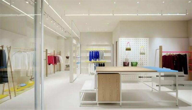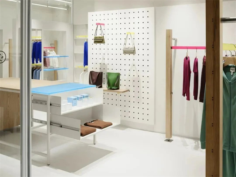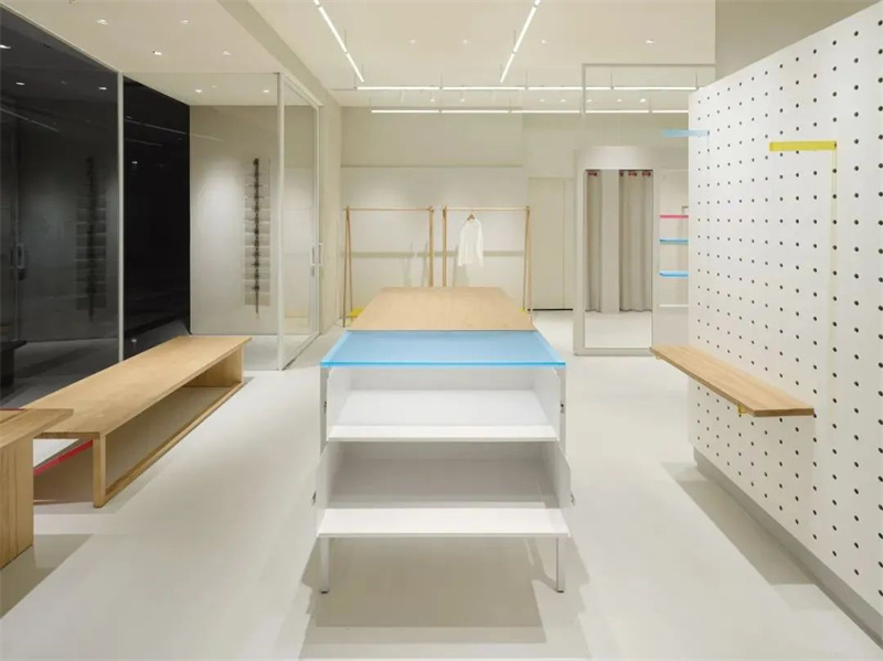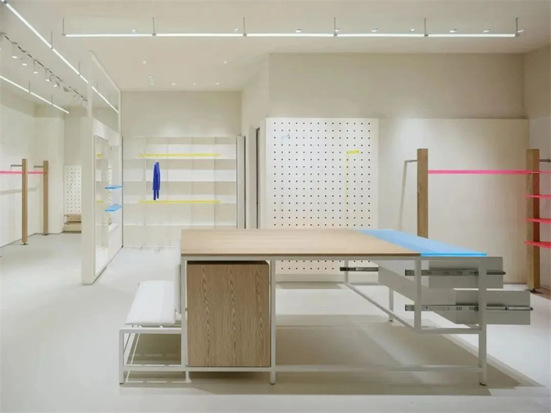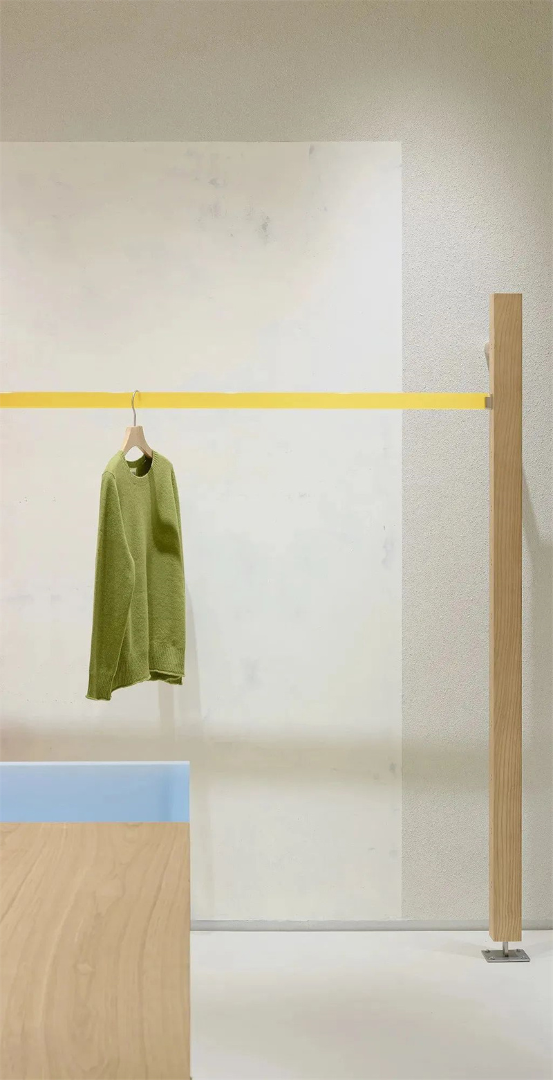In contrast, adjacent to this, is another kind of “white”, thicker, with a rougher texture, which also achieved through the trowel application of the coating. This part emphasizes a more “new” sensation, as the original base is solidly covered, presenting a purer tone. This starkly contrasts with the coloured acrylic sections of the custom furniture in the concept store, creating a vibrant backdrop for the diverse range of hues that will showcase upcoming clothing.