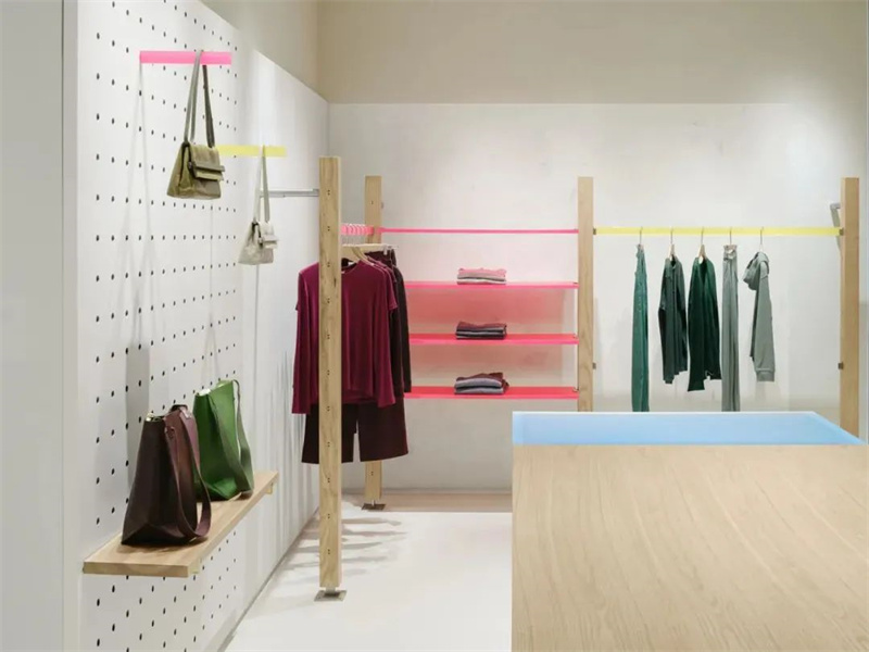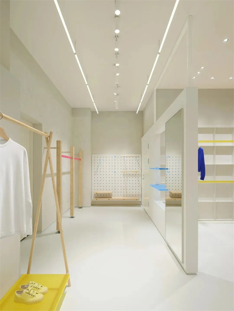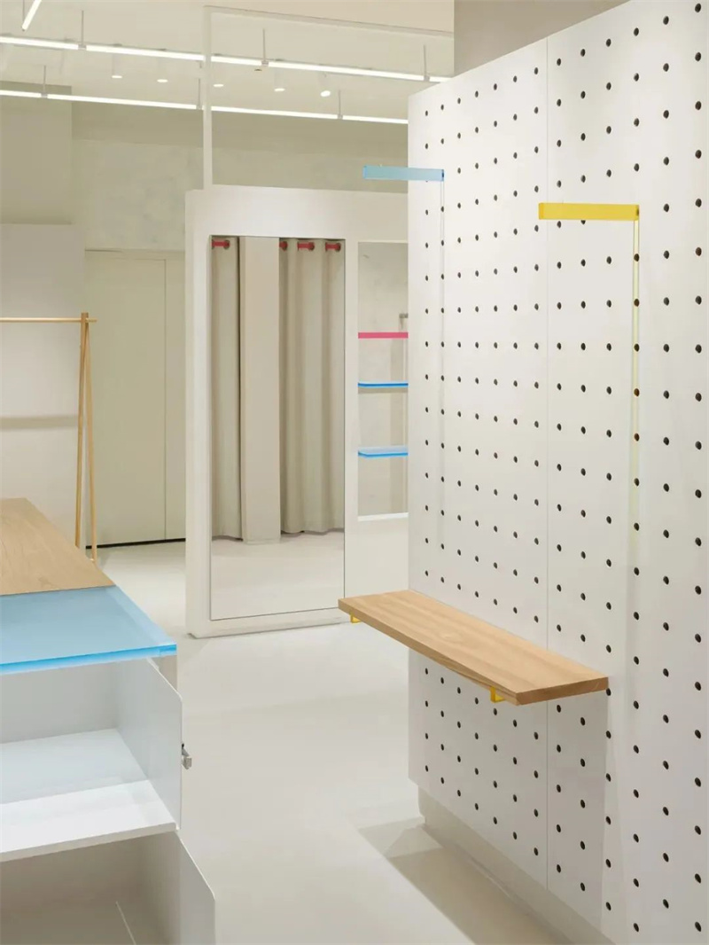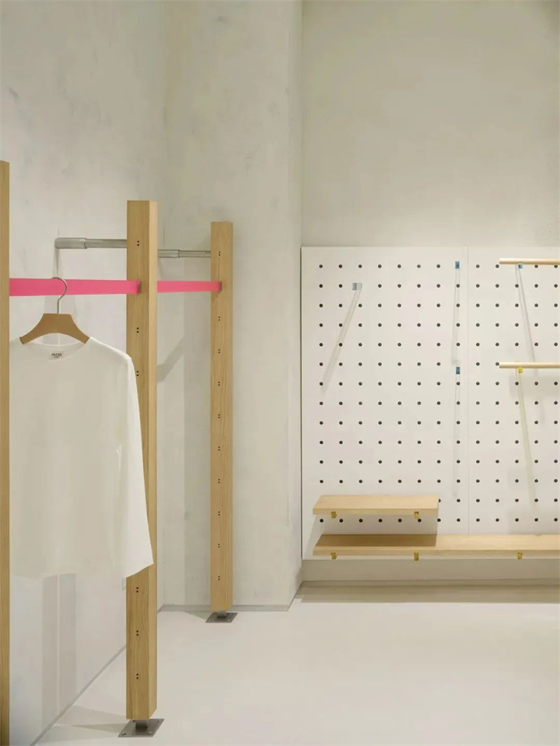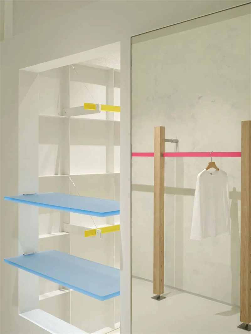 与此形成对比的,是旁边更为厚实、肌理更加粗糙的另一种“白”,同样由艺术水泥批刮而成。这一部分更强调“新”的感觉,原本的基底被严严实实地覆盖,呈现出尤为纯粹的色调,与买手店内定制家具的彩色亚克力部分形成更鲜明的反差,也为更好地衬托出现在空间里繁多色彩的品牌服装。
