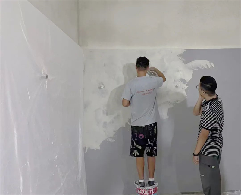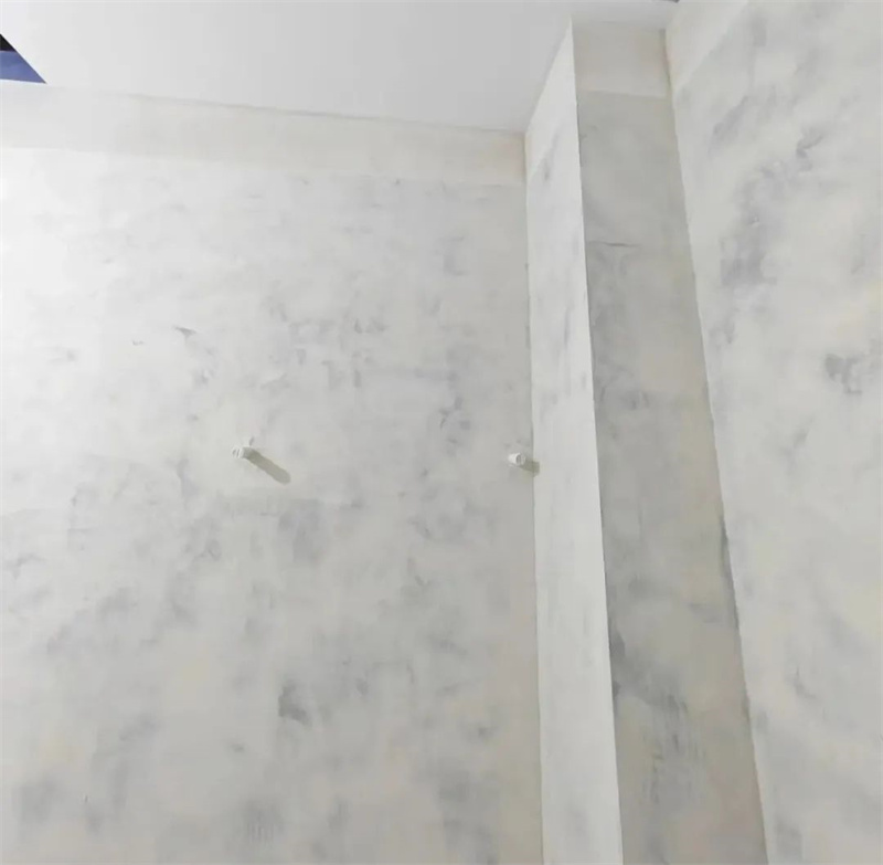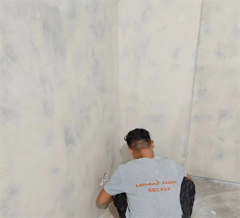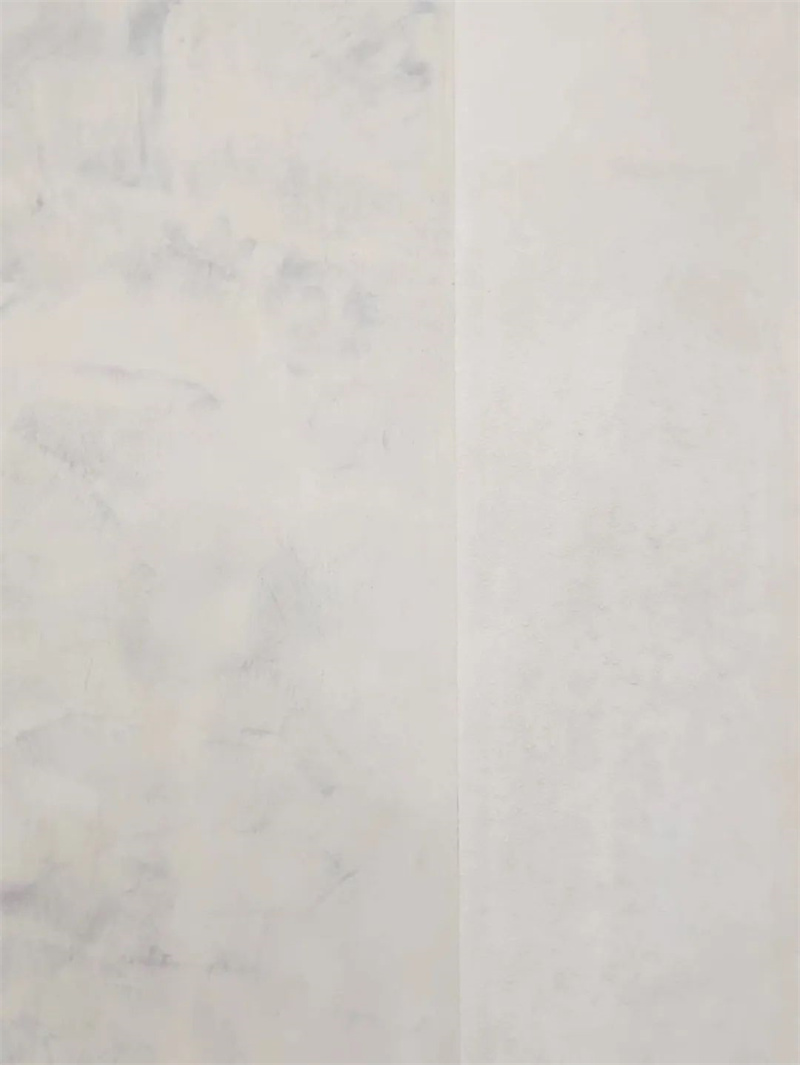 Overlaying warm white paint with the artistically applied, unordered trowel texture of Cement Design coating, creating a thin layer that covers the wall base. The blue beneath the white subtly emerges, akin to veins beneath the skin. With each breath, time flows like blood, seemingly effortless. Perhaps, this is the feeling Malevich spoke of, “swim in the white free abyss”.
