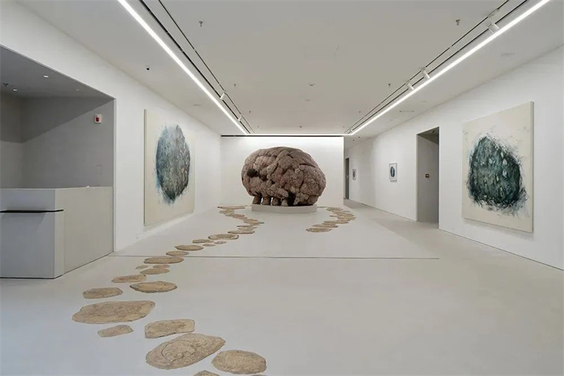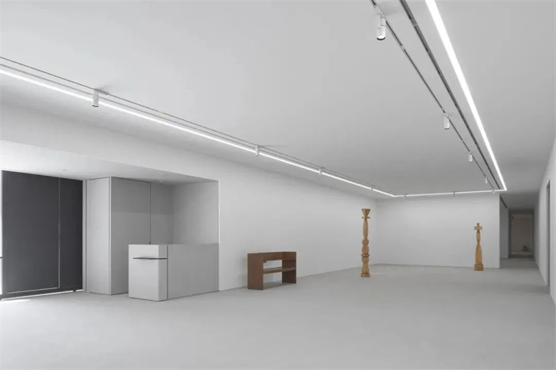 Thanks to the continuous application capability of Cement Design’s material, the entire flooring of the gallery extends seamlessly into the internal negotiation area beyond the adjacent wall, without any visible seams. This effect not only ensures the overall integrity of the space but also further diminishes environmental disruptions for exhibition viewing.