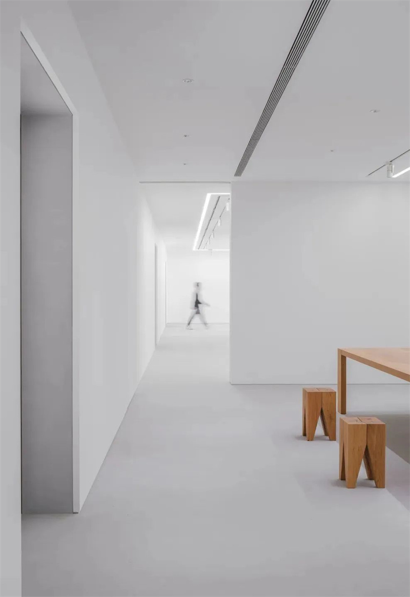 得益于 Cement Design 材料可以进行连续涂抹的特性,整个画廊的地面,延伸到一墙之隔的内部的洽谈区,没有任何接缝,这样的效果不仅保证了空间的整体性,还进一步弱化了观展的环境干扰因素。