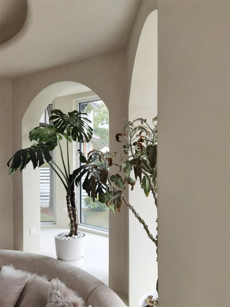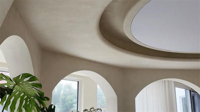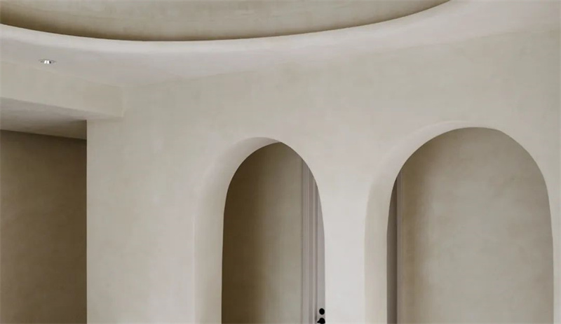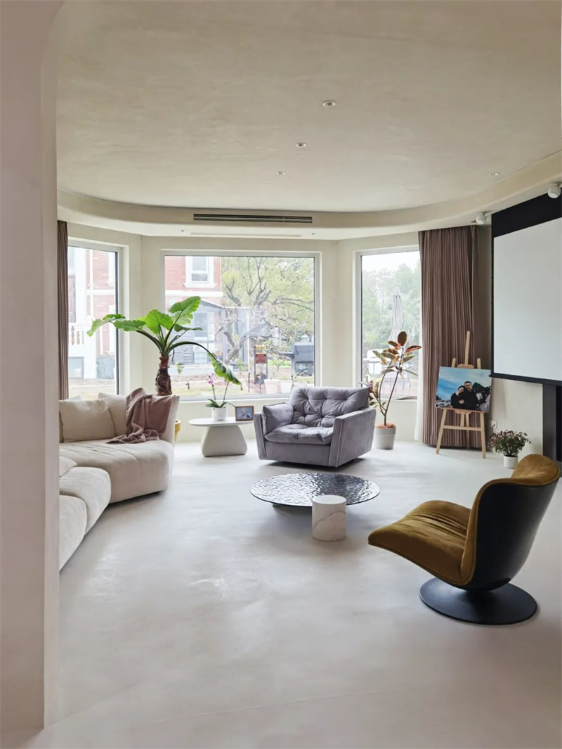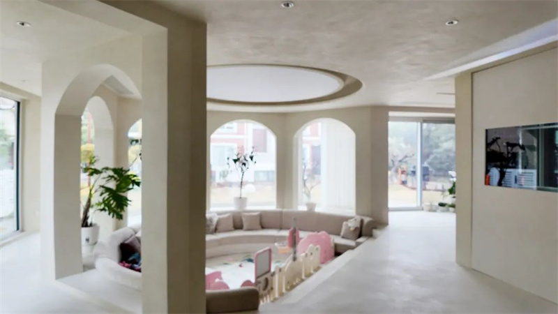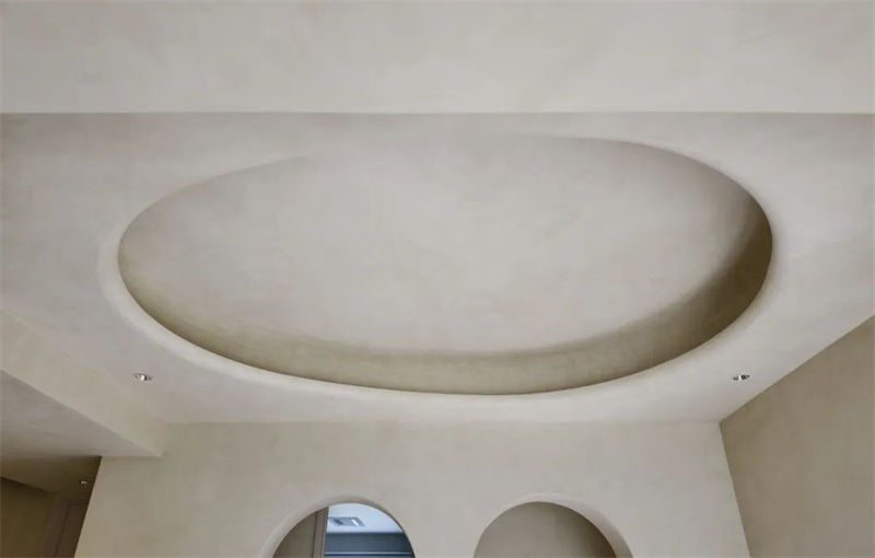 The second floor is a perfect fusion of straight lines and curves. The circular ceiling design harmonizes with the living room on the first floor, and the intricate curvature, meticulously crafted by Cement Design artisans, extends from the ceiling to the walls. Two arched doorways rhythmically echo the elements of curvature.