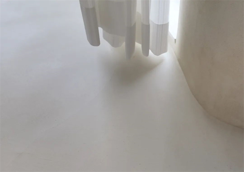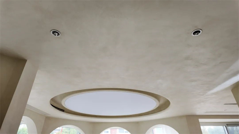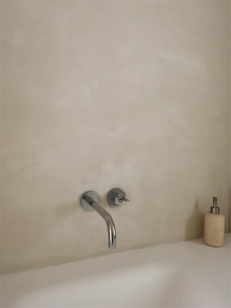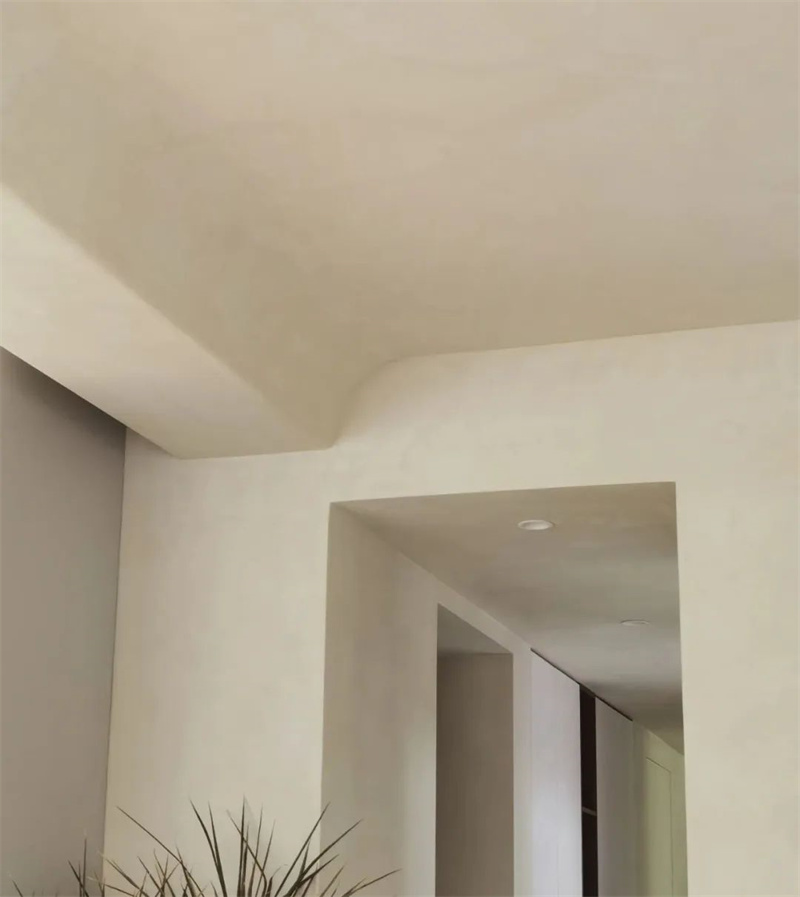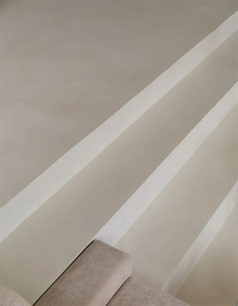 The second floor is a perfect fusion of straight lines and curves. The circular ceiling design harmonizes with the living room on the first floor, and the intricate curvature, meticulously crafted by Cement Design artisans, extends from the ceiling to the walls. Two arched doorways rhythmically echo the elements of curvature.