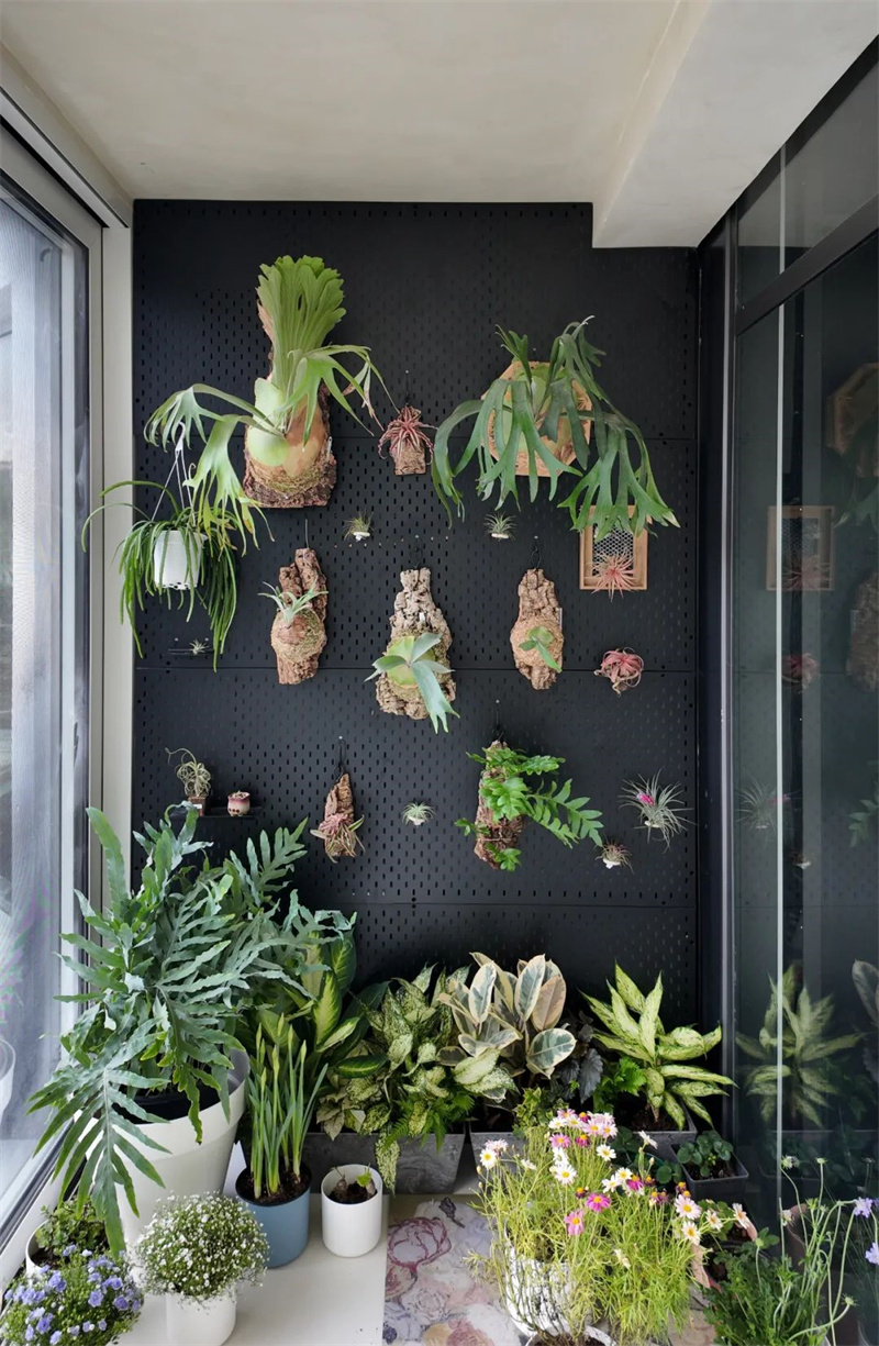 In one corner of the living room, there is also the homeowner's indoor garden, where decorative plants are vertically displayed, extending to potted plants on the floor, creating a casually vibrant atmosphere.