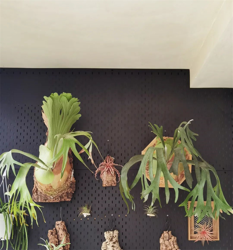 客厅一角还有主人的室内花园,观赏植物在垂直维度展示,延伸到地面的盆栽,漫不经心又生机勃勃。