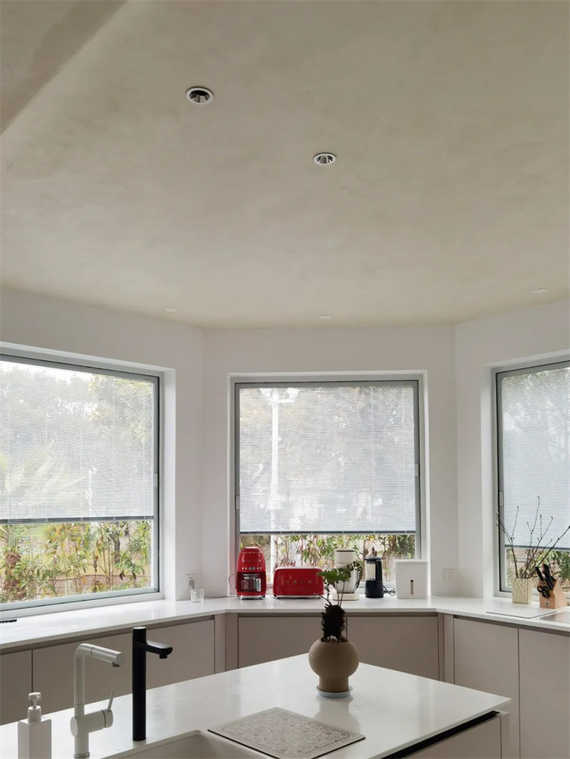 客厅旁边是开放式厨房和相连的偏厅。数扇宽大的窗户将光明引入整个厨房,而在正上方,一道横梁,以其独特的曲线,在Cement Design材料的巧妙装饰下,让阳光在天花板上投下更加层次分明的影子。这个空间仿佛是一首由光和影谱写的诗,将简单的功能区域转化为艺术的表达。