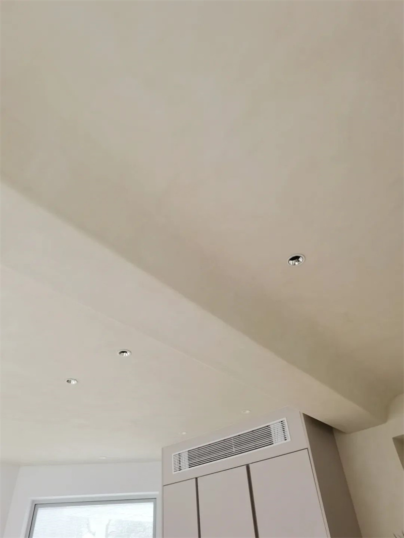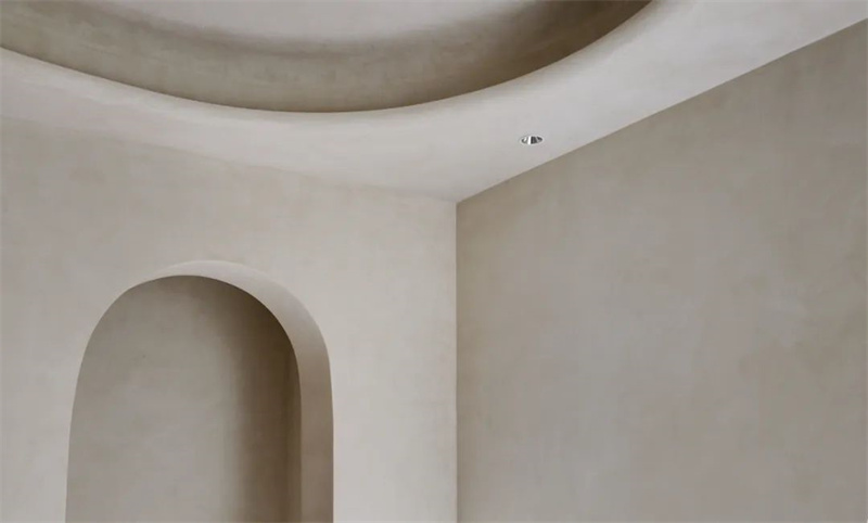二楼是直线和圆弧的完美交融。天花的圆环造型与一楼客厅呼应,细致的弧形处理由Cement Design工匠一点一点手工呈现。从天花到墙面,两个拱形门洞回应着弧形元素的韵律。