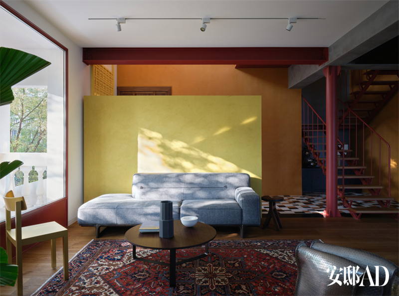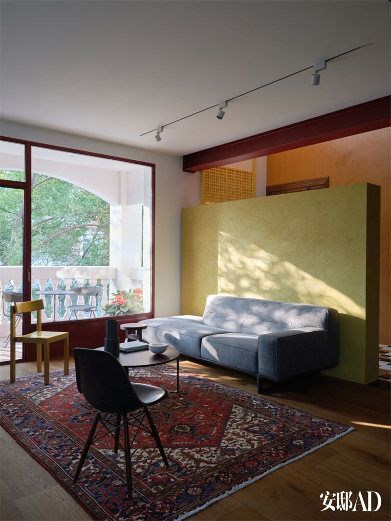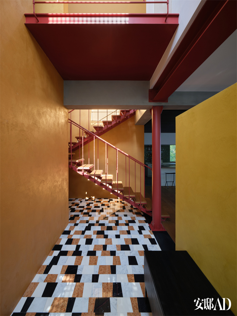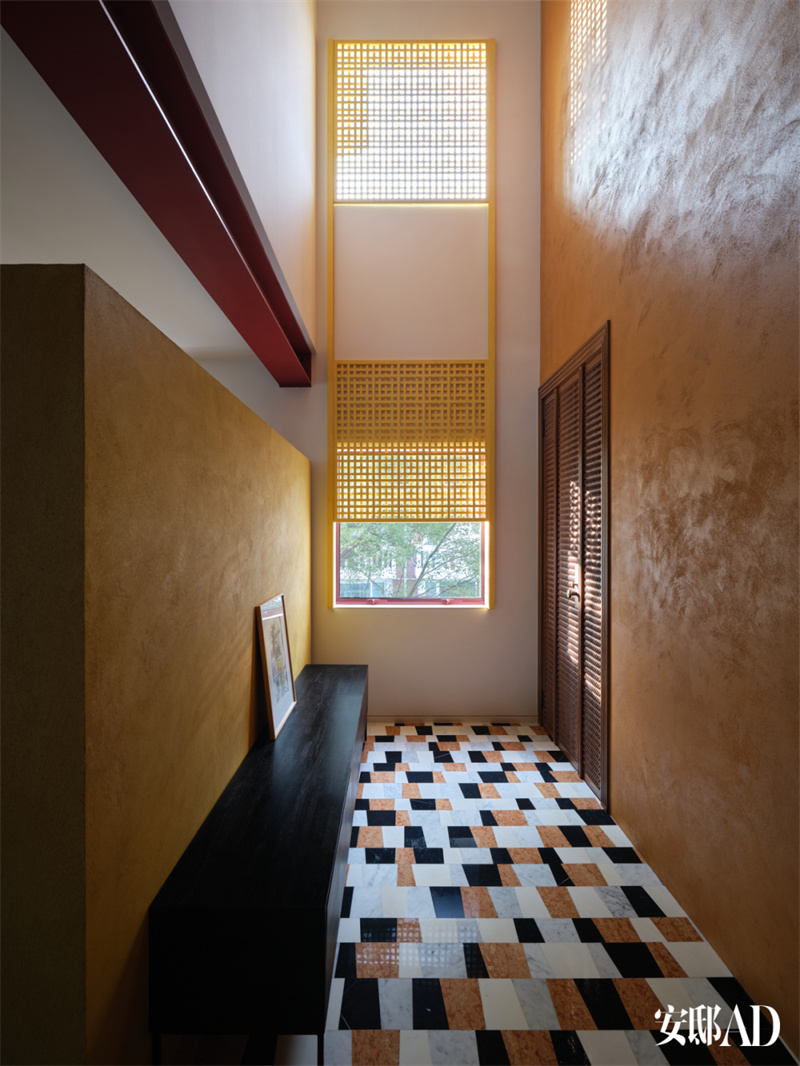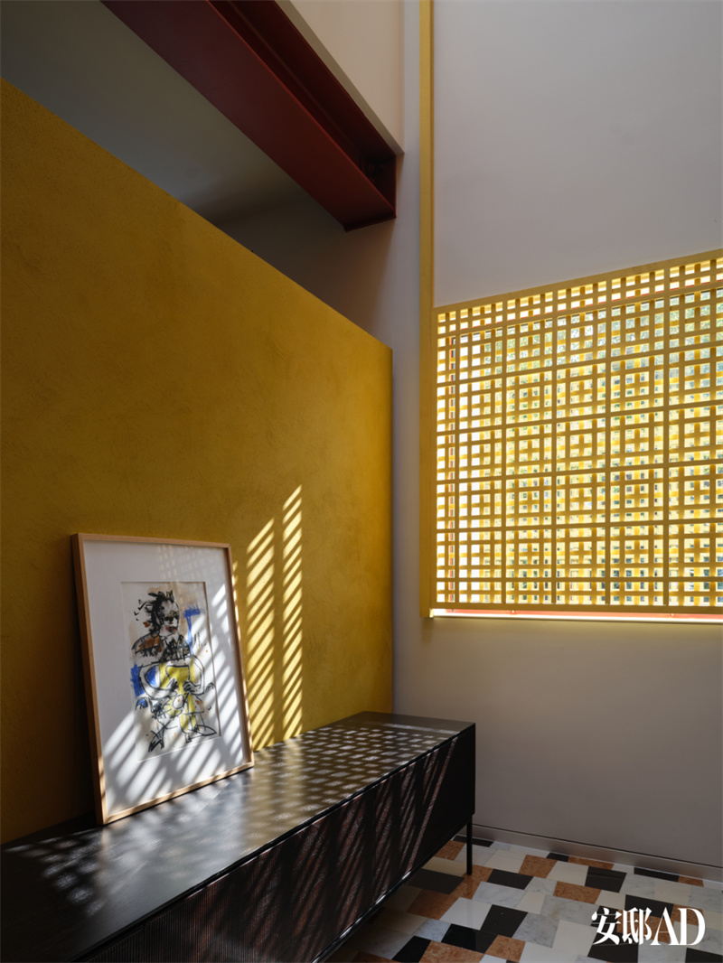 这不仅是凯伦的第一个私宅项目,也是她真正意义上的第一个自己的家。 推门而入,首先看到的是一段黄色矮墙,一侧是绛红色的窗框和明黄色的窗格, 脚下是白、灰、橙、黑四种颜色的大理石拼接而成的图案。这一切都预示着我正在步入的空间和眼下流行的“侘寂风”毫无关系。“我希望家是温馨的,我先生则坚持家不能‘做作’,这是我们的审美底线。”凯伦告诉我。