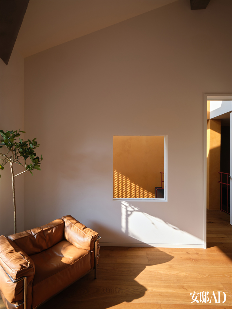 在二层主卧,窗边放着Cassina的单人沙发。阳光透过黄色窗格,在墙上留下斑驳的影子。