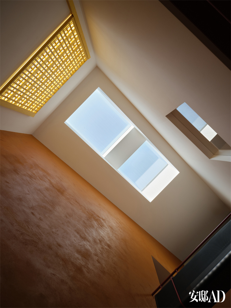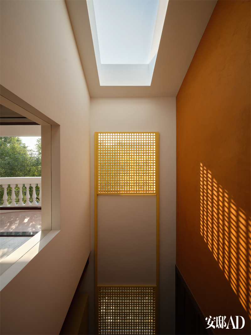 入口的门厅被打开并与二层连通,拥有极好的采光。暖黄色的微水泥墙面为家带来温暖感。三种色彩拼接的大理石令空间充满活泼的气息。特别设计的黄色窗格可以控制光照强度。打开屋顶结构后,凯伦还特别设计了天窗。
