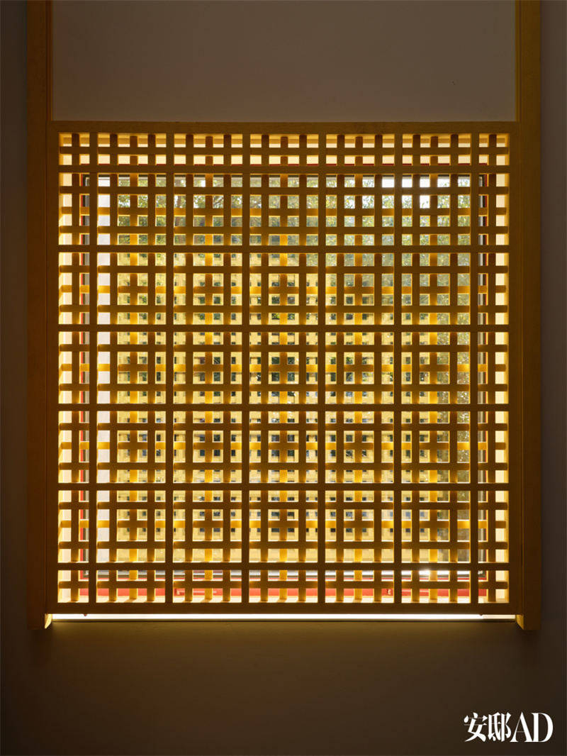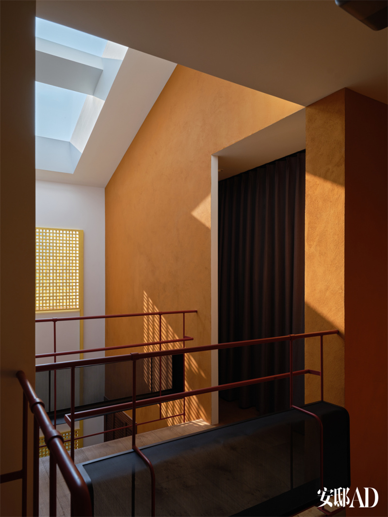 她将一层、二层侧墙的两扇窗全部改造为整幅玻璃的大钢窗,并在窗框内设计了可以控制光强度的明黄色活动窗格。由此,阳光得以从四面八方洒入,透过窗格、透过墙面,随着时间变化,慢慢在空间里晕染开来。“我希望回家的时候能有一道温暖的光。”凯伦回忆起当时的设计初衷,“这些其实都参考了巴拉甘的经典做法,他曾在包括自宅在内的诸多项目中大量使用黄色、格栅等元素。”