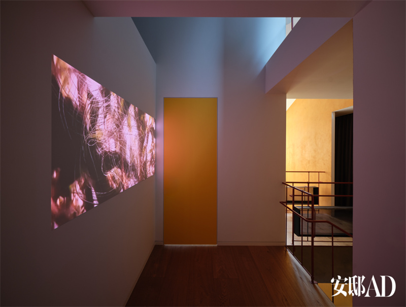二层楼梯口,墙面上是青年艺术家RJ Tripodi的影像作品。屋主就连主卧的门也选择了黄色。