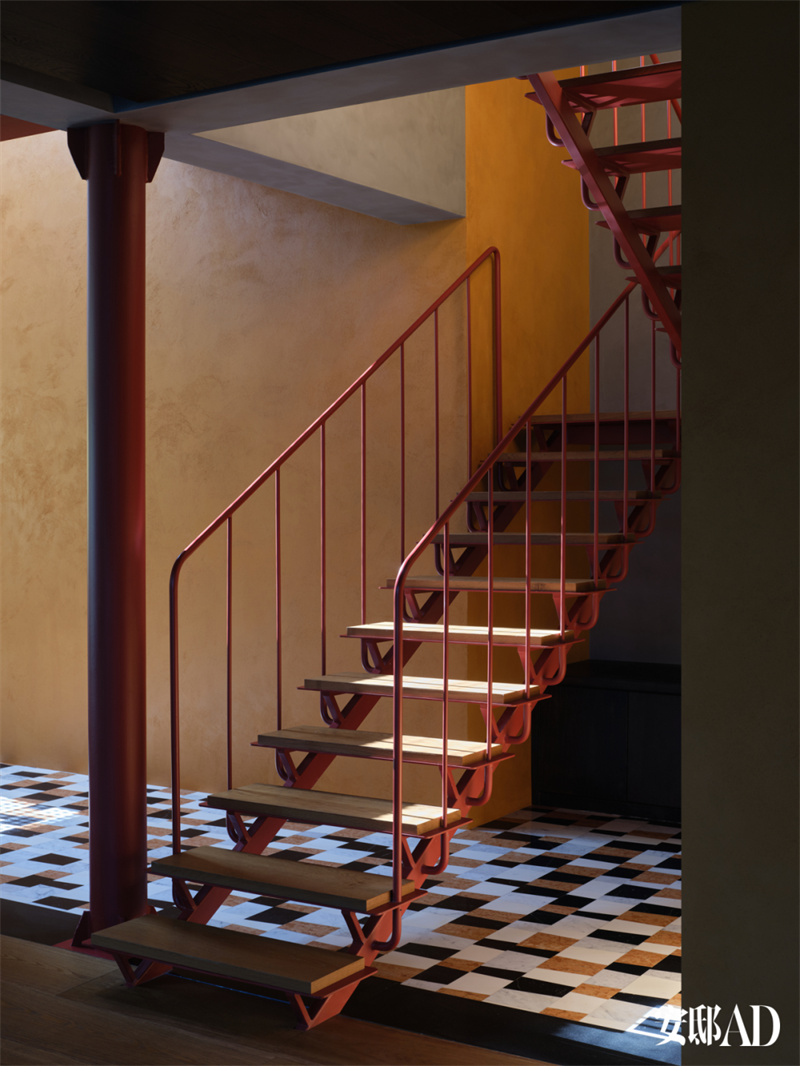 空间结构原有的柱子被保留并漆成红色。纤细的楼梯也被漆成了同样的色彩。红色和黄色为空间注入了生机。