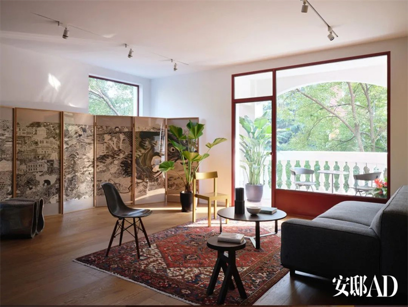 柚木屏风是客厅的点睛之笔,这是青年艺术家张文智创作的《黑龙引》。屏风前放着凯伦的先生、青年艺术家RJ Tripodi的金属雕塑《耳垂》。地上的花毯来自Zamani,沙发出自Natuzzi Italia。阳台上放着Magis的户外桌椅。