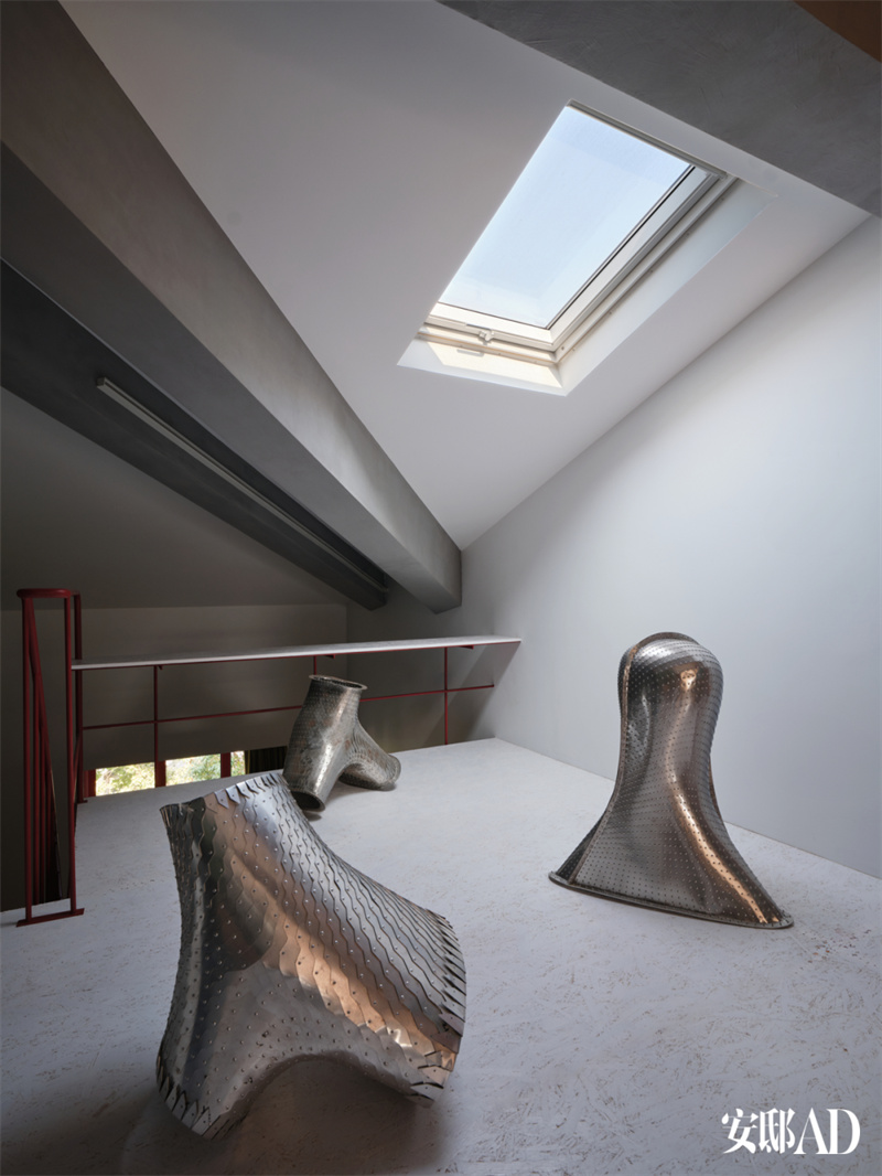 阁楼上放着RJ Tripodi的金属雕塑《沉默》和《小胖骨》。
