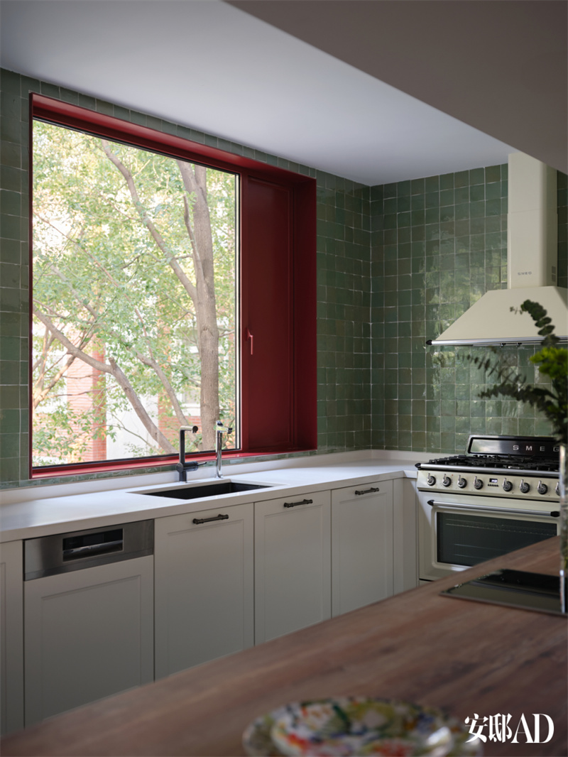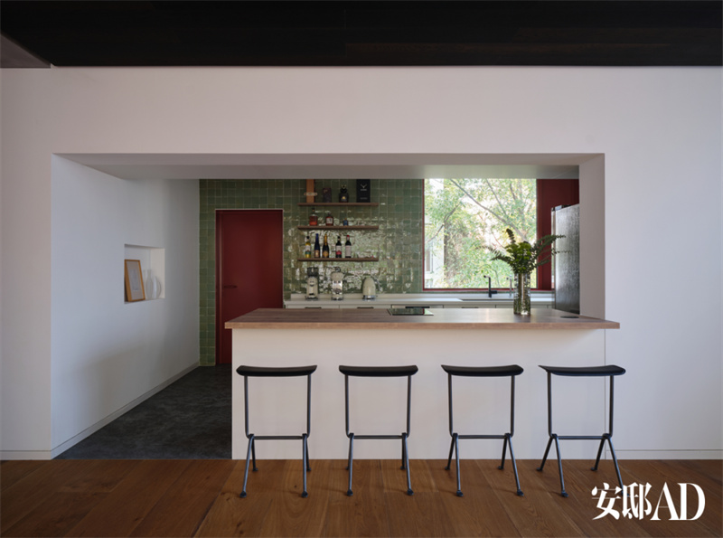 开放式厨房具有开阔的视野。绿色瓷砖和红色门窗相映成趣,吧凳来自Magis。玄关处放着绘有活泼人物的小画,名字叫Here she comes。