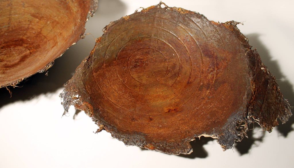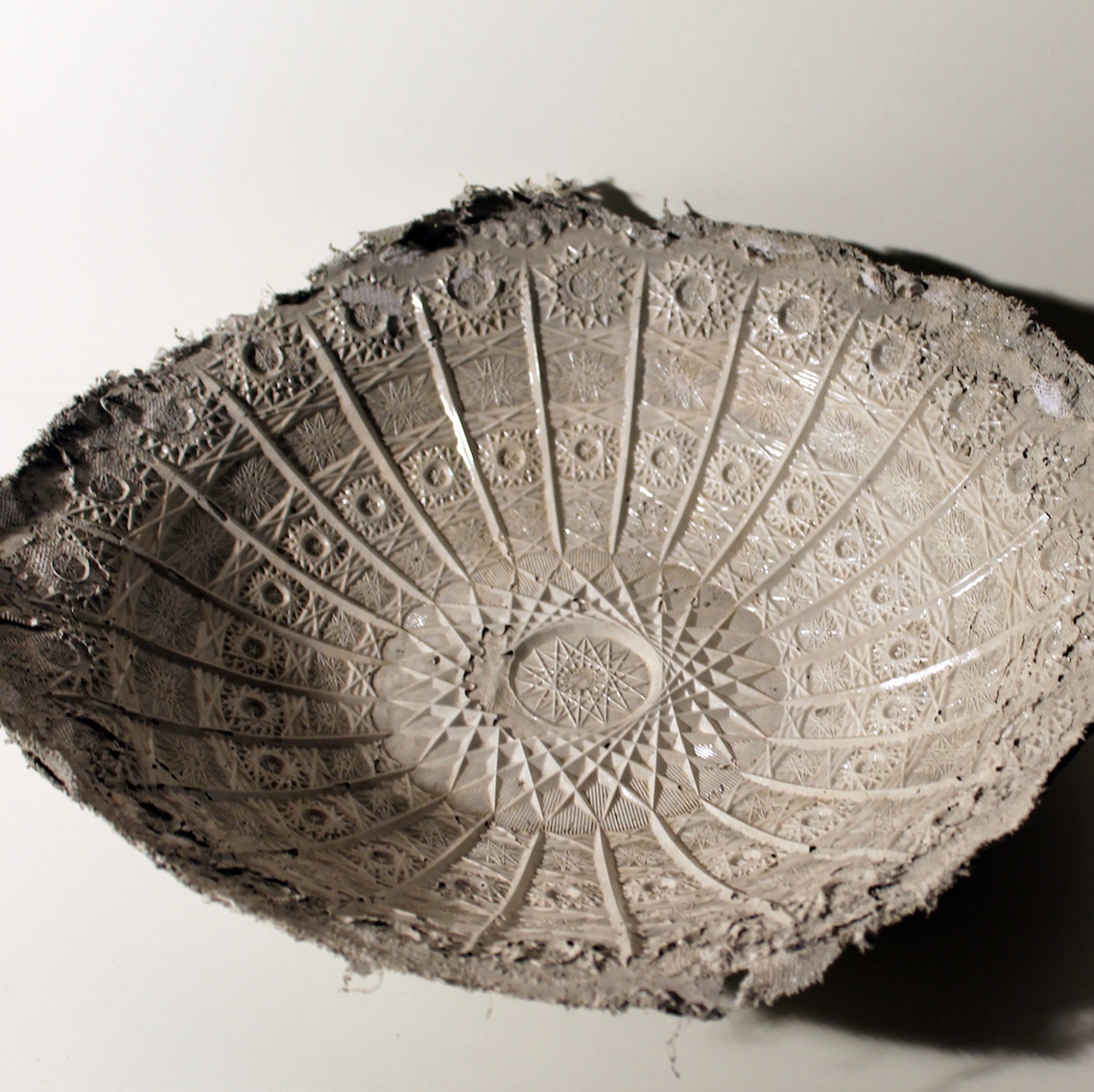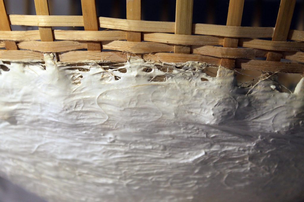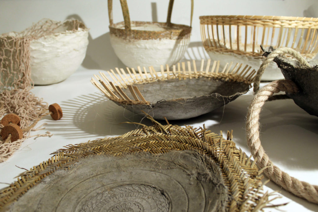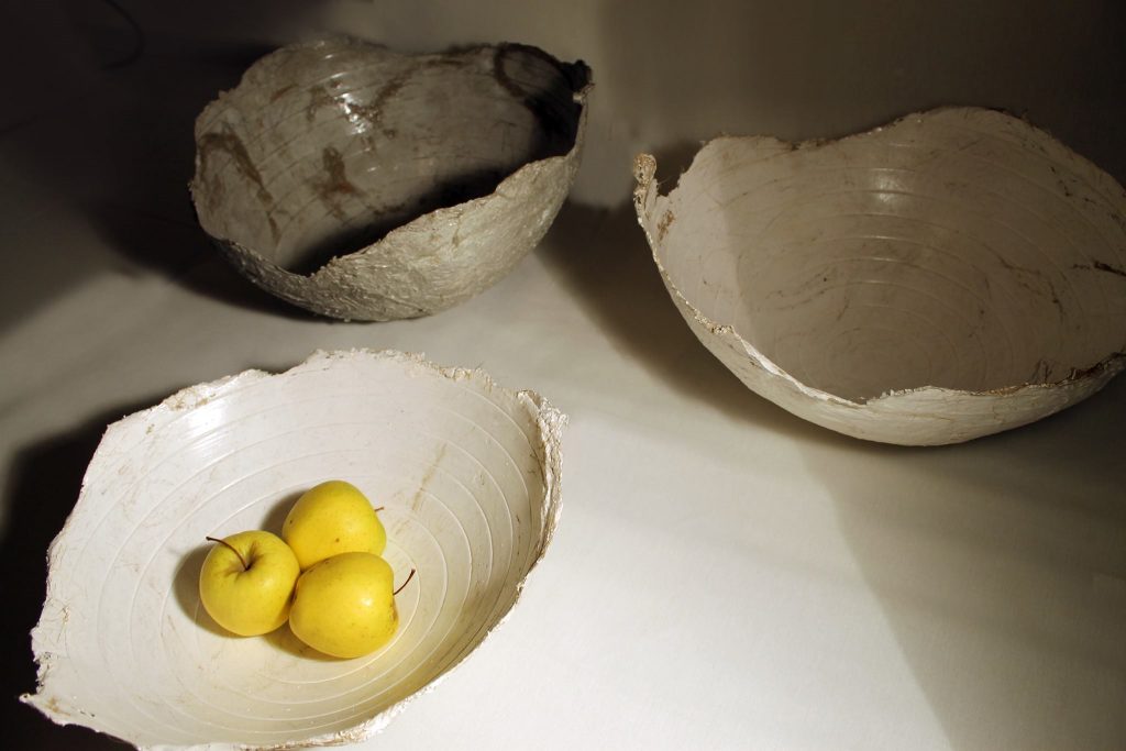 他收集的实验碗,由水泥,水和液压大麻螺纹混合而成,是设计用品重新发现使用纸浆技术的最好例子。